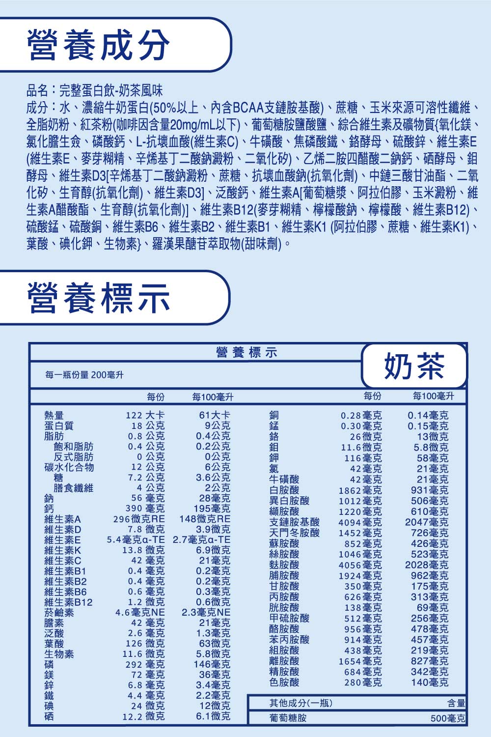 世界冠軍特優級蛋白,18克完整蛋白質,4015毫克BCAA支鏈胺基酸,營養約等於5.2瓶鮮奶、22瓶滴雞精,幫助肌肉生長,增強體力